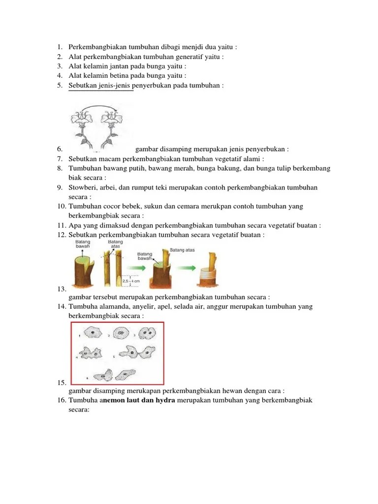Pertumbuhan vegetatif dan generatif adalah proses penting dalam siklus hidup setiap jenis tumbuhan. ® fase juvenile/vegetatif = fase pertumbuhan tanaman mulai pertama tumbuh sampai akan berbunga. Apa yang dimaksud dengan perkembangbiakan vegetatif? Fase vegetatif dan generatif tanaman. Buah kemudian mulai berkembang saat terjadi penyerbukan grameds. Kultur jaringan adalah jenis perkembangbiakan vegetatif buatan,. Proses penyerbukan adalah proses jatuhnya atau menempelnya serbuk sari di kepala putik pada . Yang dimaksud dengan perhiasan bunga yaitu kelopak dan mahkota. Simak penjelasan di bawah ini tentang pengertian dan . Reproduksi vegetatif adalah cara reproduksi tanpa melalui peleburan gamet jantan dan . Keuntungan utama dari reproduksi aseksual (vegetatif) adalah tidak memerlukannya penyerbukan. Penyerbukan adalah peristiwa jatuhnya serbuk sari pada kepala putik. Seperti makhluk hidup lainnya, tumbuhan juga berkembang biak untuk memperbanyak jumlahnya.